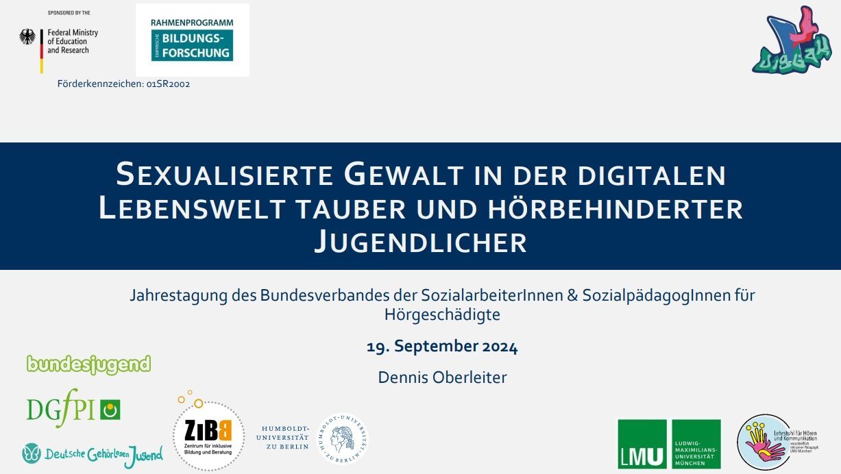 Am 19. September 2024 hielt Dennis Oberleiter auf der Jahrestagung des Bundesverbandes der SozialarbeiterInnen & SozialpädagogInnen für Hörgeschädigte (BvSH) im Schloss Fürstenried, München, einen Gastvortrag für rund 60 Fachkräfte der Sozialen Arbeit und Sozialpädagogik im Feld Hören und Kommunikation. Im Fokus stand das Thema „Sexualisierte Gewalt in der digitalen Lebenswelt tauber und hörbehinderter Jugendlicher“.